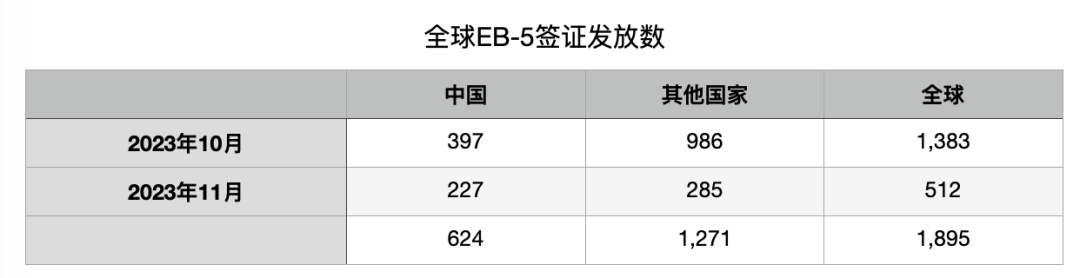2024新财年,前两个月(2023年10-11月)全球共计发放了1895张EB-5签证,其中中国大陆申请人获得624张。同上,该数据仅是美国使领馆的EB-5签证发放数据,不包括移民局批准I-485后签发的情况。